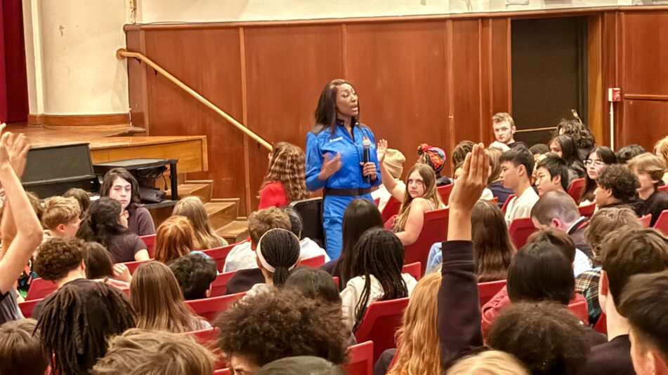 A year after her all-female mission aboard Blue Origin’s New Shepard, the Slauson alum returns to a cheering crowd of eighth graders, sharing her path and fielding questions