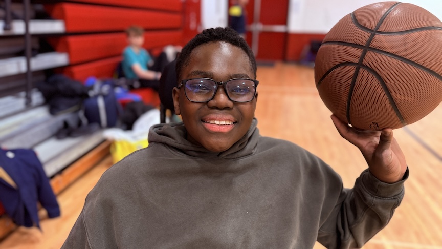 Kam has been playing basketball since he was four years old, developing his skills from his wheelchair and improving year by year. Now, for the first time, his adaptive sports experience is fully integrated into a general intramural setting, as he plays alongside his peers on the Forsythe sixth-grade intramural basketball team.